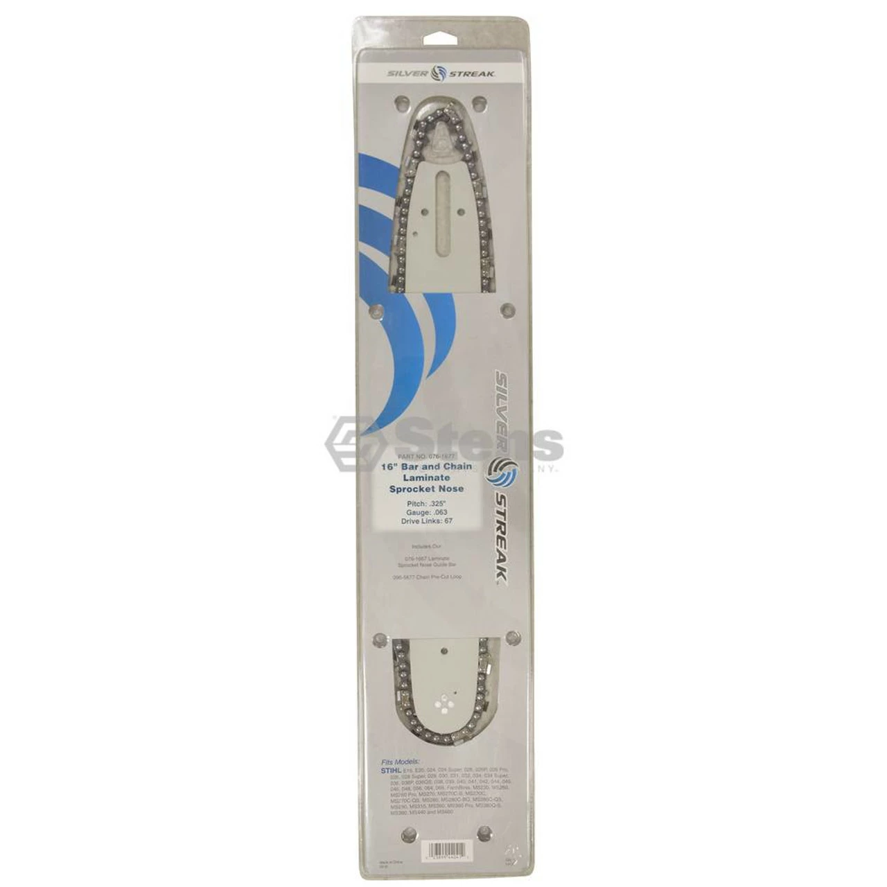 Bar Type: Laminate sprocket nose, Pitch: .325″, Drive Links: 67, Gauge: .063, Packaging Type: Branded sleeve, Length: 16 “
